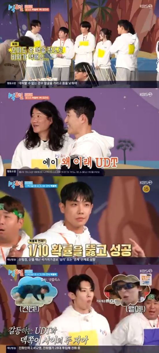 다음 대진은 딘딘-덱스, 문세윤-한해로 결정됐다. 한해는 딘딘을 탈락시킨 뒤 "UDT 잡아보자"고 승부욕을 드러냈다.