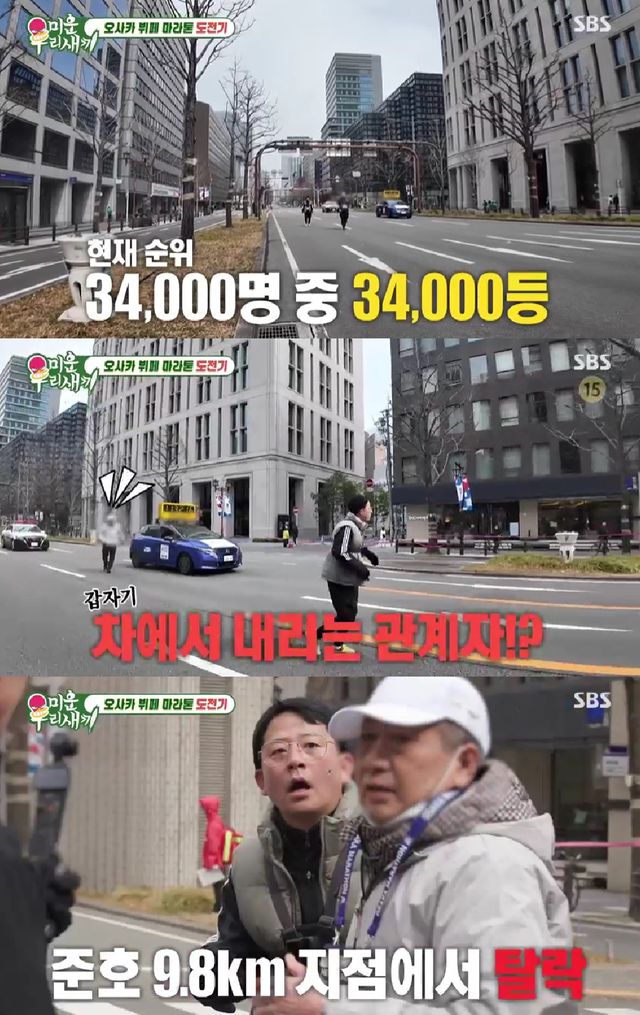 결국 김준호는 3만4000명의 참가자 중에서 꼴찌를 모면하지 못했고, 옆으로는 관계자 차가 따라붙었다.