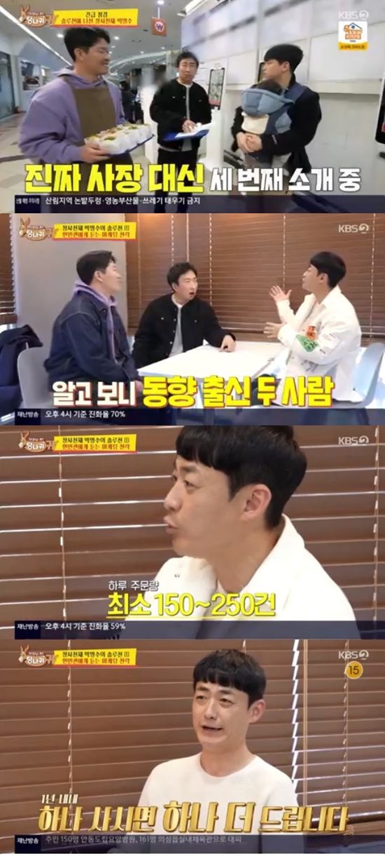 박명수는 한민관에게 하루 매출을 물어봤다. 한민관은 "월 매출이 1억 가까이 된다. 하루에 최고 150에서 250건은 나간다"고 했다.