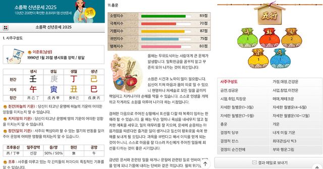 온라인 사주 전문 사이트 '위키사주'는 오랜 전통을 바탕으로 한 사주팔자와 현대적인 분석 기술을 결합하여 각자의 운명을 상세히 분석한다. 이름과 생년월일, 태어난 시간과 성별을 입력하면 간단하게 이용할 수 있다. 특히, 앞으로 3년 동안의 애정을 꿰뚫어볼 수 있는 애정운, 냉정하고 속시원한 궁합, 사랑에 관한 모든 것을 담은 타로까지 다양한 운세를 재미있게 점칠 수 있다.