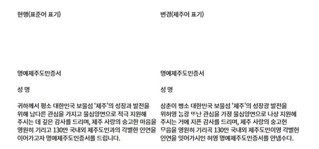 앞으로 새로 제작되는 '명예제주도민증서'는 이런 내용의 제주어로 표기한다. 제주특별자치도는 명예도민 선정자에게 수여하는 명예도민 증서패의 문구를 표준어에서 제주어로 변경한다고 24일 밝혔다.