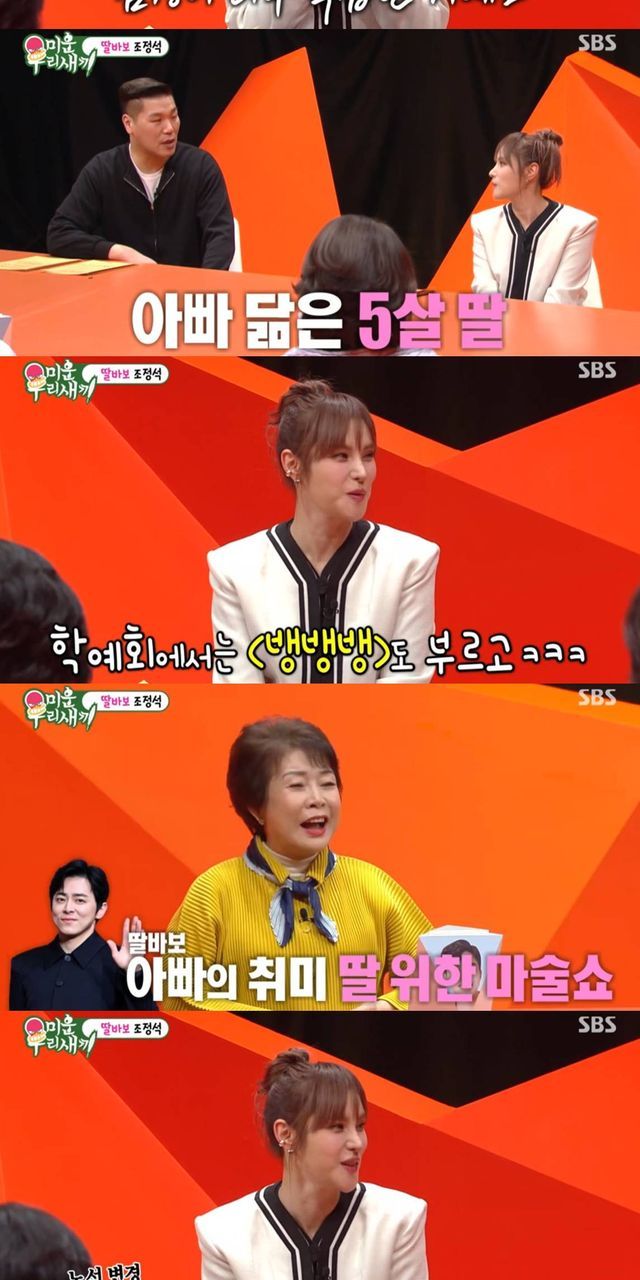 이후 신동엽은 "조정석 씨가 정말 딸바보라고 한다"라고 말했다. 딸은 5살이라고. 누구를 좀 더 닮았냐는 물음에 거미는 "아빠를 진짜 많이 닮았다. 딱 봐서는 모르시는데 아빠 어릴 때 사진 보면 진짜 똑같고 근육의 움직임이 똑같다. 습관이나 성향이 진짜 많이 똑같다. 아로하도 부르고 학예회에서는 빅뱅의 '뱅뱅뱅'도 부르고"라며 근황을 전했다.