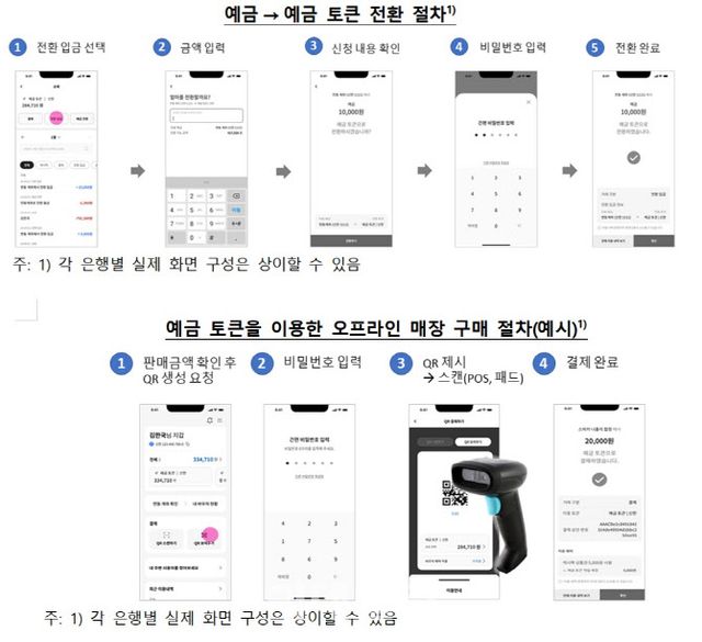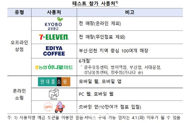 테스트 기간은 4월 1일부터 6월 30일까지이다. 사전 신청을 완료한 일반 이용자들은 내달 1일 오전 10시부터 참가은행 지정 앱을 통한 비대면 방식으로 전자지갑을 개설할 수 있다. 이용자들은 △서점(교보문고 전 매장, 온라인 제외) △편의점(세븐일레븐 전 매장, 무인점포 제외) △커피 전문점(이디야 커피, 부산·인천 중심 100여개 매장) △마트(농협하나로마트 6개점) 등 오프라인 상점과 △홈쇼핑(현대홈쇼핑, 모바일 웹 및 앱), K-POP 굿즈(COSMO, PC 및 모바일 웹), 배달플랫폼(땡겨요, 모바일 앱) 등 온라인 쇼핑에서 예금 토큰을 이용할 수 있다.