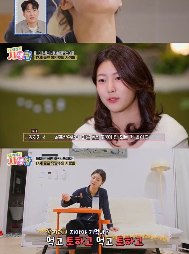 송지아는 "선배들 중에 마르신 분들이 분유 먹고 많은 도움을 받았다고 해서 먹는다. 비거리도 잘 안 나가고, 마르면 체력적으로도 문제가 좀 있다. 골프선수한테 마른 몸은 도움이 안 되는 거 같다"며 분유를 먹는 이유를 밝혔다.