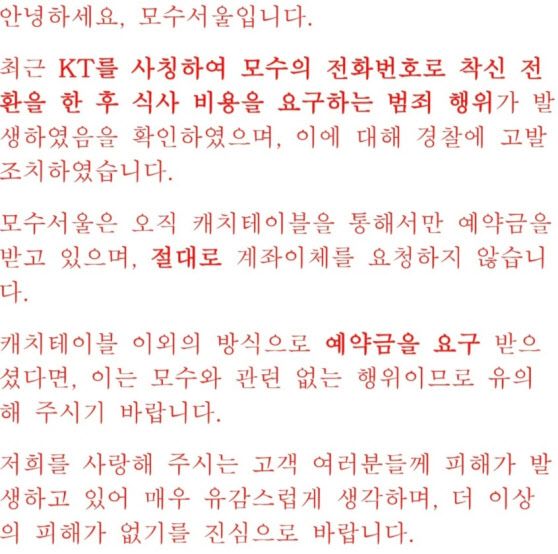 소식이 알려진 뒤 ‘모수 서울’은 23일 공식 사회관계망서비스(SNS)에 ‘모수 서울 예약에 대한 긴급 공지’라며 “최근 KT를 사칭해 모수 전화번호로 착신 전환을 한 후 식사 비용을 요구하는 범죄 행위가 발생했음을 확인했다”고 밝혔다.
