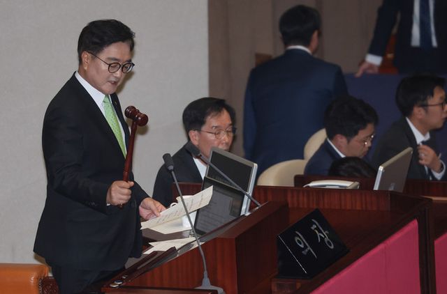 우원식 국회의장이 지난해 12월27일 국회 본회의에서 한덕수 국무총리 탄핵소추안에 대한 가결을 선포하고 있다. ⓒ 연합뉴스