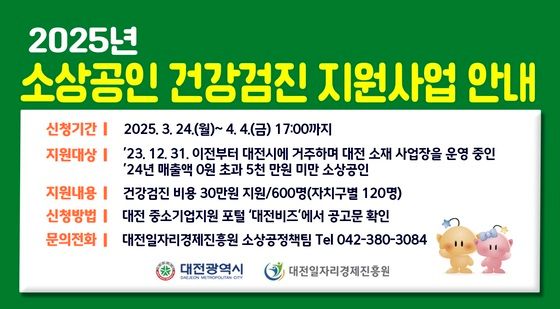 이번건강검진지원사업역시그일환으로.소상공인1인당최대30만원의검진비용을지원한다.선정된대상자는협약검진센터등에서올해9월13일까지별도비용없이검진을받을수있다.검진비용은대전시가검진병원에일괄지급한다.