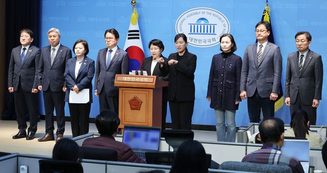 조국혁신당 김선민 당대표 권한대행과 의원들이 24일 국회 소통관에서 한덕수 국무총리에 대한 탄핵소추 기각과 관련해 기자회견을 하고 있다. ⓒ 연합뉴스