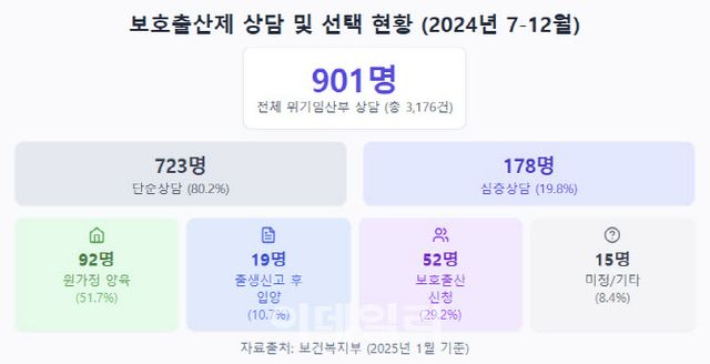 24일 보건복지부에 따르면, 지난해 7월 ‘위기 임신 및 보호출산 지원과 아동 보호에 관한 특별법’ 시행 이후 6개월간 전국 16개 지역상담기관에서 901명의 위기임산부에게 총 3176건의 상담이 진행됐다. 이 중 178명이 심층상담을 받았고 52명이 보호출산을 신청했다.