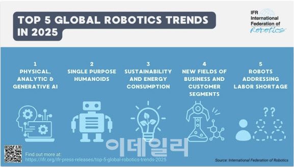 24일 국제로봇연맹(IFR)이 최근 발표한 ‘2025년 글로벌 로보틱스 트렌드 톱 5’ 보고서를 보면 △피지컬·분석적·생성형 AI △단일 목적 휴머노이드 △지속 가능성과 에너지 소비 △새로운 비즈니스 분야와 시장 세분화 △인력 부족을 해결하는 로봇이 꼽혔다.