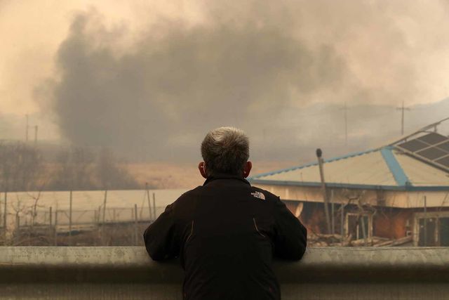 24일 오후 경북 의성군 점곡면 사촌리에 있는 한 저온창고에 강풍을 타고 산불이 번지자 인근 주민이 안타까운 심정으로 바라보고 있다. / 뉴스1