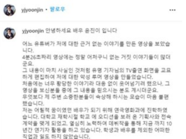 이 논란이 불거지자 윤진이는 즉각 반박에 나섰다. 2022년 4월 22일 자신의 인스타그램을 통해 “유튜버가 내 이름을 거론하며 조작된 영상을 만들었다.