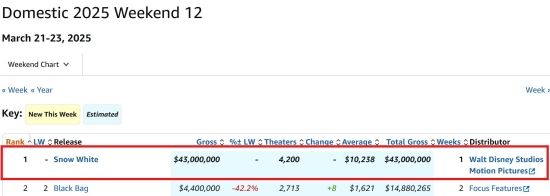 (엑스포츠뉴스 황수연 기자) 영화 '백설공주'(감독 마크 웹)가 지난 21일 북미 개봉과 동시에 북미 박스오피스 정상에 등극했다.