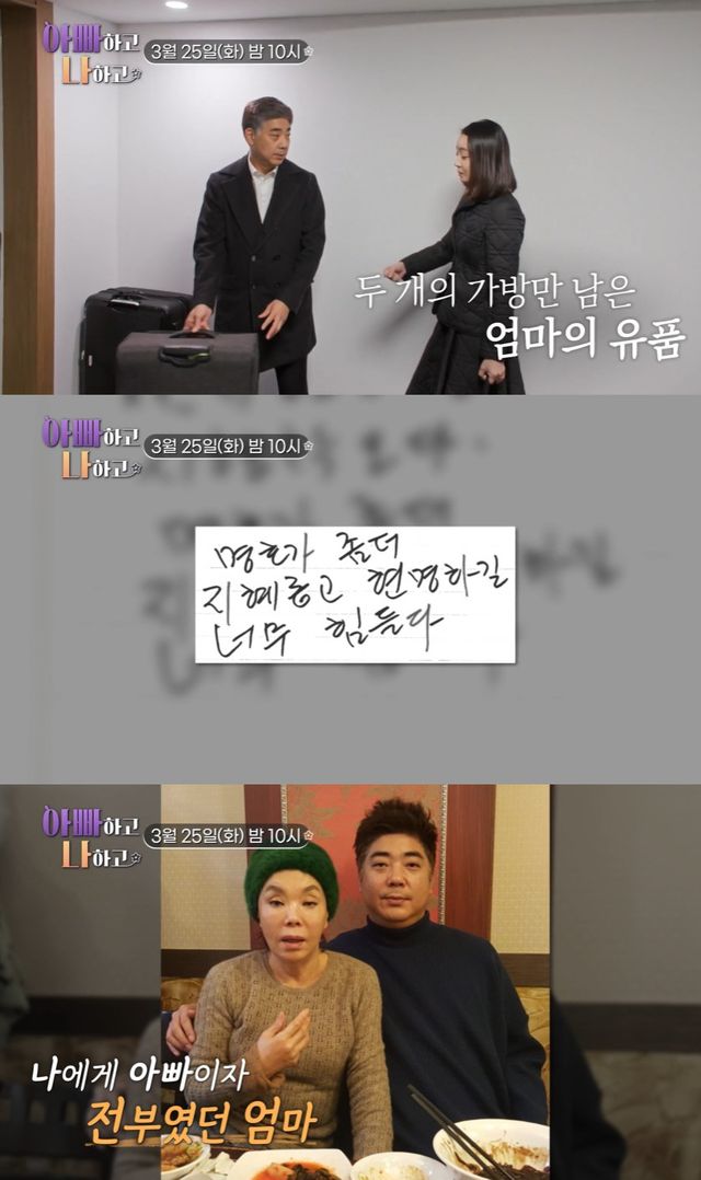 유품을 살피던 서효림 부부는 "이렇게 다 모아놓은 사람이 있을까"라며 생전 김수미의 물건들을 살폈다. 앞서 '아빠하고 나하고' 측은 유품 속에서는 수백 장의 복권과 통장 뭉치가 발견됐다고 밝힌 바 있다. 서효림과 정명호는 故김수미가 남긴 재산과 기록들을 살펴보며 엄마의 빈 자리를 마주한다.