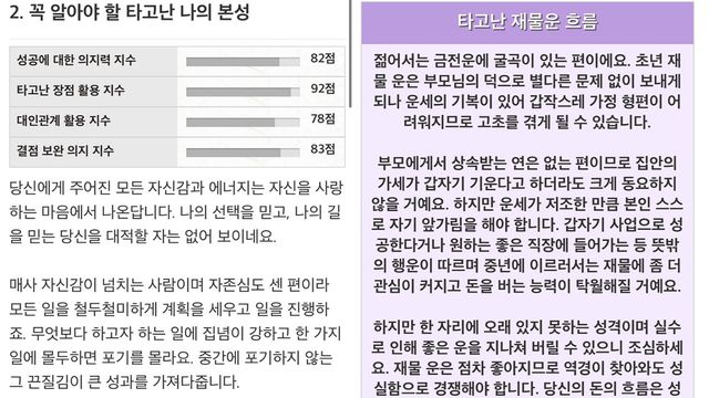 온라인 사주 전문 사이트 '위키사주'는 오랜 전통을 바탕으로 한 사주팔자와 현대적인 분석 기술을 결합하여 각자의 운명을 상세히 분석한다. 이름과 생년월일, 태어난 시간과 성별을 입력하면 간단하게 이용할 수 있다. 만사형통 내 운명의 비밀 사주, 쓸모있는 사주 감정, 복잡한 세상 편하게 사는 소름돋는 비법 사주까지 다양한 운세를 재미있게 점칠 수 있다.