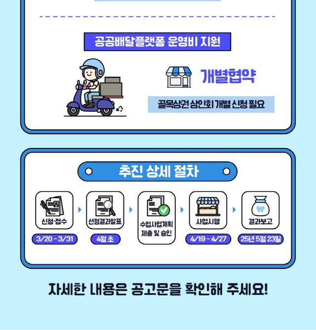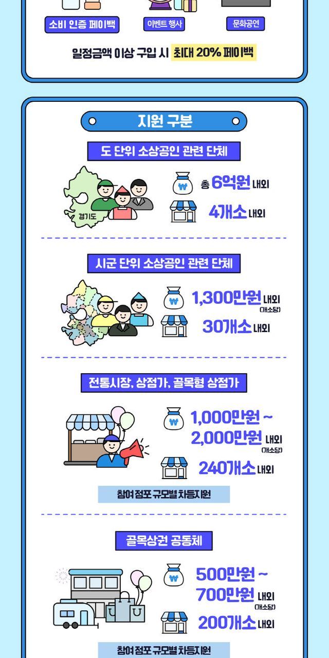 상반기에는 최대 500여 곳 내외 지원을 목표로 하고 있다. 세부 지원규모는 ▲경기도 단위 상권단체 4개소 ▲시군 단위 상권단체 30개소 ▲전통시장, 상점가, 골목형상점가 240개소 ▲골목상권 공동체 200개소로 '소비인증 페이백', '통큰 세일 소비촉진 쿠폰 지원', '경품 이벤트' 등 상권 활성화 행사를 진행할 계획이다.