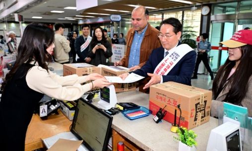 | ▲ 유정복 인천광역시장이 24일 남인천우체국에서 인천거주 외국인들과 제1호 아이(i) 글로벌 택배를 발송하고 있다. |