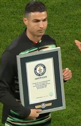 이날 호날두는 덴마크와의 경기 전 기네스 상패를 수여 받았다.