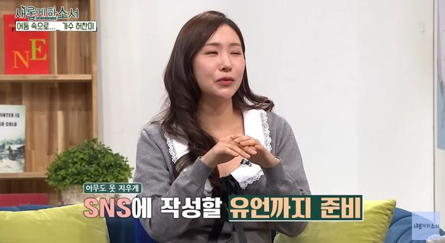 허찬미는 “그래서 제가 많은 사람들이 이 모습을 보고 나를 그렇게 바라본다는 생각이 들다보니, 밖을 못 나가겠더라”라며 “재기가 힘들겠구나, 가수 생활도 할 수 없겠다는 생각이 들었다. 극단적인 생각도 했다. SNS에 올릴 유언을 다 써놓기도 했다. 게시물을 올리고 세상을 떠나려고 마음을 먹었었다”라고 고백해 충격을 안겨줬다.