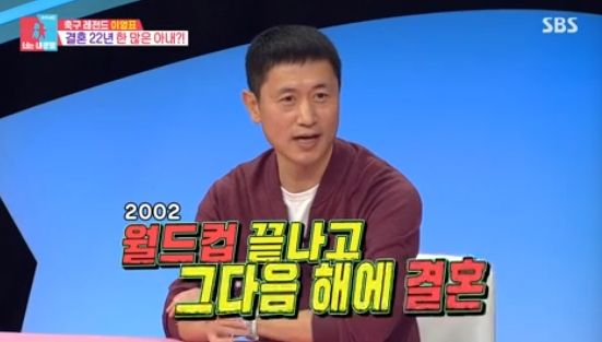 이날 이영표는 "결혼 22년차다. 2002 월드컵 끝나고 그 다음 해에 했다. 그 당시에 제가 26살이었다"면서 "아내가 첫사랑이다. 처음 사귄 여자친구였는데, 결혼까지 했다. 첫사랑이자 마지막 사랑"이라고 했다.