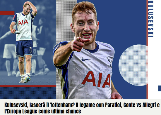 이탈리아 이적 매체 '칼치오 메르카토'는 24일(한국시간) "과거 아탈란타와 유벤투스에서 뛰었던 공격형 미드필더의 토트넘 이탈 소식이 들리고 있다"며 "쿨루세브스키와 토트넘의 계약기간은 2028년 6월30일까지로 길게 남아 있지만 이미 지난 겨울 AC밀란이 그의 영입을 생각했다. 다른 프리미어리그 구단들도 그의 에이전트와 접촉하는 것으로 보인다"고 했다.