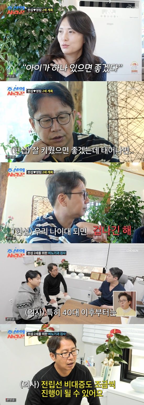 심현섭은 "태어나면 잘 키웠으면 좋겠다"면서도 "근데 우리 나이대 되면 겁나긴 하다. (내 나이 54세에) 왕성하겠나"라고 걱정했다. 그러면서 "올챙이(정자) 확인할 수 있는데, 비뇨기과 가서 검사해야한다"며 "결혼 선배 이천수가 병원 예약해놨다"고 이야기했다.