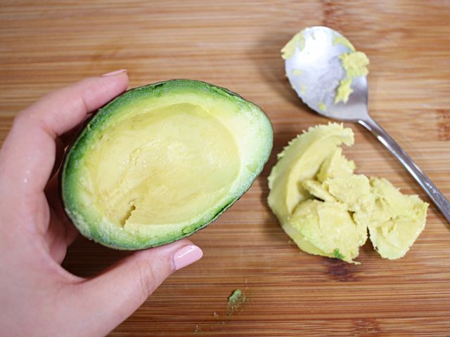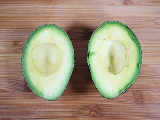 잘 익은 아보카도를 반으로 잘라서 씨를 제거해 주세요.