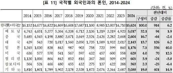 통계청 관계자는 “지난해 재혼 건수가 주춤했지만 2022년(전년 대비 32.4% 증가), 2023년(35.3% 증가) 증가분이 커서 기저효과가 있었다. 한국 여성과 베트남 남성의 재혼 건수는 꾸준한 상승세”라며 “한국인으로 귀화한 베트남 여성이 (베트남 남성과 재혼하는 경우가) 좀 있다고 보는 것이 합리적”이라고 분석했다.