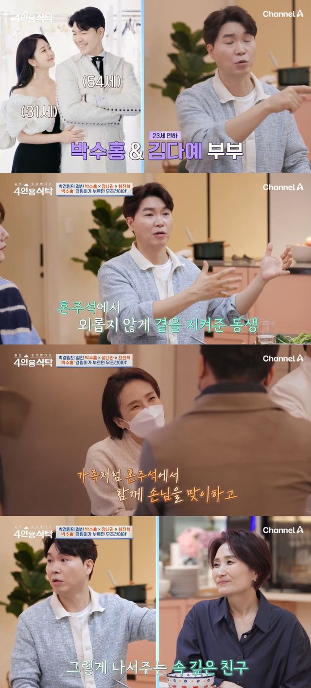 24일 방송한 채널A '절친 토큐멘터리 4인용식탁'에는 박경림과 그의 절친 박수홍, 장나라, 최진혁이 출연했다.