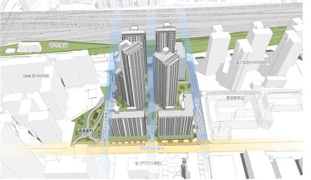 특히, 대상지 내부 도로 폐도 후 한 개의 사업구역으로 통합 개발하고, 폐도되는 도로를 대신해 주택단지 내에 공공보행통로를 조성해 성산시영아파트와 경의선 선형의 숲길까지 연계함과 동시에 신설되는 공공공지 및 개방형 공동이용시설을 편리하게 이용할 수 있는 보행환경을 조성했다.