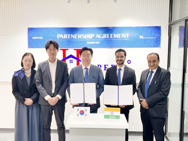 심기봉 덴티스 대표(좌측에서 세번째)와 아만 카푸어(우측에서 두번째) 인도 호스페디아 메디케어 대표가 업무협약을 체결하고 기념촬영을 하고 있다. ⓒ 덴티스