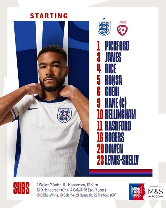 중원에선 데클란 라이스와 주드 벨링엄이 호흡을 맞췄다. 2선에는 재러드 보언, 모건 로저스, 마커스 래시퍼드가 배치됐다. 최전방 원톱으로 해리 케인이 출전했다.