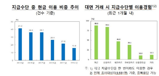 반면 현금 이용 비중은 추세적으로 감소하는 모습이다. 지급수단 중 현금 이용 비중은 2013년 41.3%에서 2017년 36.1%, 2019년 26.4%, 2021년 21.6%, 2024년 15.9%로 나타났다. 다만 최근 1개월 내 대면 거래 시 이용경험을 물은 설문에서는 현금이 높은 응답(88.0%)을 보여 대면 거래에서 여전히 보편적인 지급수단 중 하나인 것으로 파악됐다.