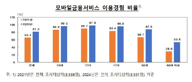 이는 2021년 조사의 모바일금융서비스 이용경험 비율(65.4%)과 비교해 15.9%포인트(p) 상승한 수치다. 모바일금융서비스는 은행, 증권사, 카드사, IT기업 등이 모바일기기를 통해 제공하는 금융서비스를 의미한다.