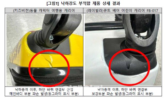 일부 제품은 내구성에도 문제가 있었다. 주행내구성, 손잡이 부착강도, 잠금장치 작동시험, 지퍼 내구성 시험 결과 모든 제품이 품질기준을 충족했지만, 외부 충격으로 인한 파손, 기능 이상 여부를 확인하는 내충격성 시험에서 2개 제품(키즈비전, 레이빌리)이 품질 기준을 충족하지 못했다.