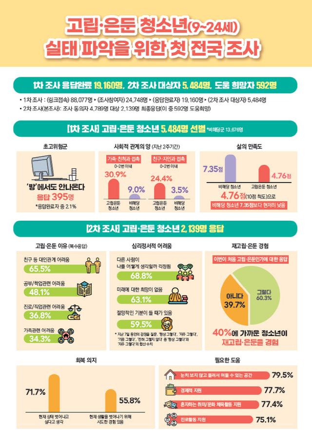 여성가족부와 한국청소년정책연구원은 25일 이같은 내용을 담은 ‘2024년 고립·은둔 청소년 실태조사’를 발표했다. 이는 우리나라 청소년의 고립·은둔 현황을 파악하고 지원 정책을 마련하기 위해 정부 차원에서 역대 처음 실시한 전국 단위 조사다. 대상은 전국 9~24세 청소년이며 이들의 특성을 반영해 온라인을 통해 진행됐다. 1차 조사(스크리닝)를 수행한 1만 9160명 중 고립·은둔 상태로 판별된 5484명에 대해 2차 조사(본조사)를 진행했고, 최종 참여한 2136명 가운데 562명이 도움받기를 희망한다고 응답했다.