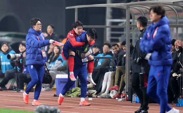지난 20일 오후 경기 고양시 고양종합운동장에서 열린 2026 국제축구연맹(FIFA) 북중미 월드컵 아시아 3차 예선 B조 7차전 대한민국과 오만의 경기에서 대한민국 이강인이 부상으로 코치진에게 업힌채로 경기장을 나서고 있다 / 뉴스1