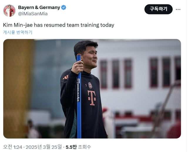 바이에른 뮌헨 소식을 X(구 트위터)에 전하는 '바이에른&저머니' 채널은 25일(한국시간) "김민재가 오늘 훈련에 돌아온 것 같다"며 훈련장에 김민재가 있는 사진을 공개했다.