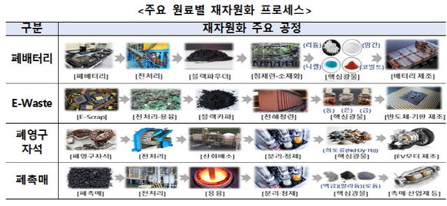 이번 추진방향을 토대로 산업 생태계 활성화에 필요한 정책도 추가 발굴한다. 산업부는 2022년 업계와 함께 핵심광물 재자원화 포럼을 출범했는데 이곳을 중심으로 필요한 정책이나 규제 해소를 발굴한다. 이와 함께 내달 기획재정부·환경부·산업부 등 관계부처 대책반(TF)을 구성해 필요한 정책 개발을 꾀한다. 올 5월엔 민간 싱크탱크 격인 핵심광물 재자원화 민간 전문위원회도 출범한다.