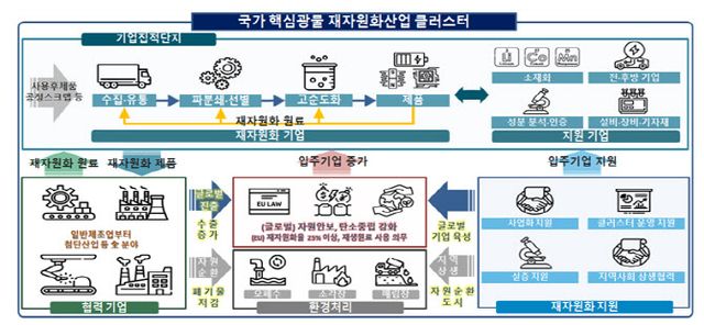 산업부와 환경부는 이에 다양한 유형의 핵심광물 재자원화 클러스터를 지정해 관련 기업과 지원 인프라를 한데 묶어 키우기로 했다. 현재도 환경부가 배터리(포항), 반도체(구미), 태양광(해남) 등 산업별 자원순환 클러스터를 지정해 운영하고 있는데, 이를 더 다양화하고 지원도 강화하겠다는 것이다.