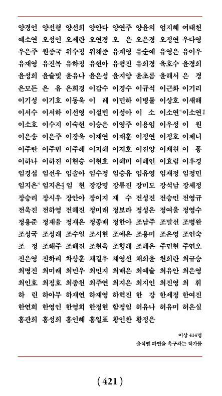 다음은 가칭 ‘윤석열 파면을 촉구하는 작가들’(414명)의 참여 명단이다.