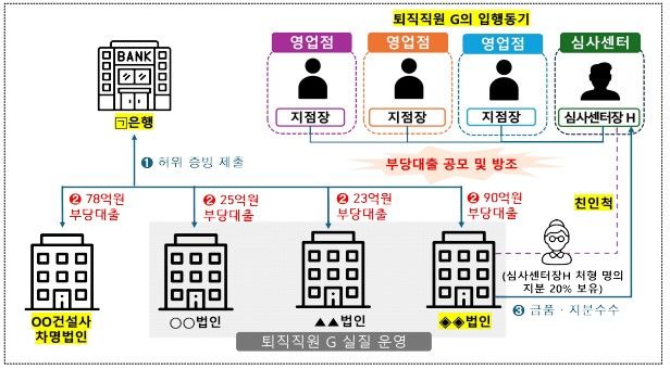 일례로 한 지점장과 G씨의 배우자는 A씨가 허위 증빙 등을 이용한 쪼개기 대출을 통해 자기자금 없이 대출금만으로 토지를 구입하려 한다는 사실을 알면서도 총 64억원의 부당대출을 취급했다.
