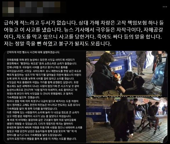 사고 당시 엑스(X·구 트위터)를 통해 피해 사실을 알린 B씨는 “샛길에서 큰 사고가 날 것 같아 농성버스쪽으로 건너가며 (A씨에) ‘사람 칠 거야. 속도 줄이라고’라 외쳤는데 본인이 아직 샛길을 다 건너지 못했음에도 코 앞까지 가속페달을 밟으며 전진했다”고 주장했다.