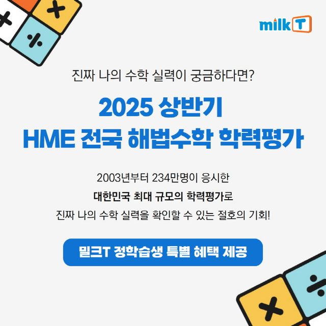 이에 천재교육 관계사인 천재교과서가 만든 디지털 학습지 밀크T초등은 2025년 상반기 HME 수학 학력평가 응시생에게 특별 혜택을 제공한다고 밝혔다.