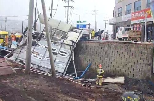 사고 목격자는 "옥상에서 구조물이 떨어지면서 전선을 건드려 불이 났다"며 "그 아래를 지나가는 차량 부근에 파편들이 떨어졌다"고 했다.