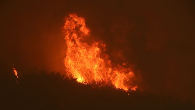 의성 산불 나흘째인 25일 오후 경북 안동시 길안면 백자리에 강풍이 불어 주변 산이 시뻘건 화염에 휩싸여 있다. 오후 3시가 조금 지났을 뿐인데 주변은 밤처럼 어두워져 있다. / 뉴스1