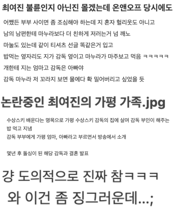 아빠라고 부르더니 그 사람이랑 결혼한거야.?, 같이 부부 방송출연까지 하는게 충격임, '부부'방송 안나오고 둘이 꽁냥꽁냥 조용히 사는 방법도 있는데ㅋㅋㅋㅋ 이것도 마음대로 안되는걸테니 하고 이해가능한 부분?ㅋㅋㅋㅋㅋ, 전부인 이야기도 듣고 싶네 아 내 머릿속에 더럽혀지는 것 같다 ㅜㅜ, 결혼 생활 중에 바람핀거냐 아니냐가 문제긴 함, 불륜이든 아니든 아빠라고 호칭하던 사람이랑 결혼하는 게 제정신인가, 엄마아빠는 나이차이도 얼마 안나는데 방송컨셉일테고 헤어지고 만난거면 불륜도 아닌데 괜찮은거 아냐 이슈화됐으니 문제있음 전아내분이 의견 내시겠지,
