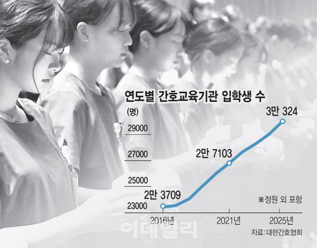 2000년대 이후 간호학과를 가진 대학·전문대학은 200개를 넘어설 정도로 늘어났다. 학과가 늘어나면서 간호대 입학정원도 매년 증가했다. 간호학과 정원은 2021년 2만 1443명(정원외 포함 2만 7129명)에서 2025년 2만 4560명(3만324명)으로 늘었다. 2025학년도 수능에 응시한 재학생 수 34만 777명 대비 8.8%에 달한다. 학령인구 대비 8% 이상이 간호사를 목표로 하고 있다는 의미다. 정원 증가에 따라 연간 배출되는 간호사 수 또한 함께 증가했는데 한국보건의료인국가시험원에 따르면 신규 간호사 면허 취득자는 2008년 1만 1333명에서 2025년 2만 3760명으로 17년 만에 약 2.1배 증가했다.