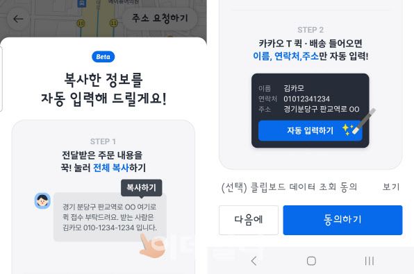 25일 업계에 따르면 카카오모빌리티는 지난 2월부터 카카오T 애플리케이션 내 ‘퀵·배송’ 서비스에 구글 ‘제미나이 플래시’를 기반으로 한 AI 주소 붙여넣기 기능을 제공하고 있다. 스마트폰 내 다른 앱 또는 메신저 등에서 주소가 담긴 텍스트를 복사하기 하면, 카카오T 퀵·배송 서비스 화면에서 직접 입력하지 않아도 AI가 주소와 연락처 등 정보를 자동 입력하는 기능이다.