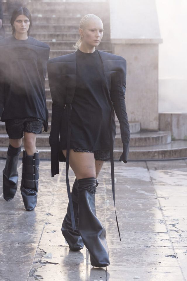 NOTE 지난 6월, 맨즈 컬렉션에서 파리의 여러 패션 스쿨에 재학 중인 학생 2백여 명을 런웨이에 세우며 ‘사랑의 군단’을 통솔했던 릭오웬스는 이번에도 그 맥을 이어갔다. 시그니처인 과장된 어깨 라인, 풍선 부츠, 얇은 명주 스톨 등 누가 봐도 ‘릭 오웬스스러운’ 차림새를 한 10여 명의 전사들이 무리 지어 걸어 나왔고, 치렁치렁한 치맛자락을 바닥에 끌며 런웨이를 장악했다. 쇼 베뉴인 팔레 드 도쿄 건물 위에서는 릭 오웬스 신전의 사도들이 꽃가루를 뿌리며 쇼에 드라마틱한 분위기를 더했다.